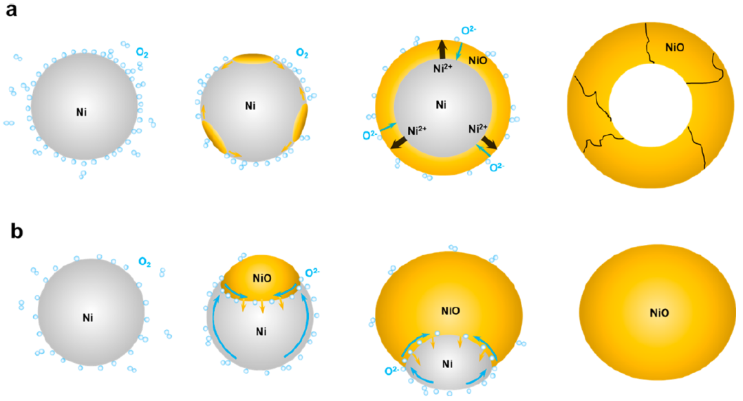 摘要:了解各种金属纳米颗粒在常压下的氧化机制,对于发挥它们在诸多领域中的价值是非常重要的。借助常压 TEM 技术,该团队研究了大气压下不同温度时镍纳米颗粒的动态氧化过程,揭示了一种温度依赖的氧化行为。温度较低(600℃)时,镍纳米颗粒的氧化遵循柯肯达尔效应,伴随着氧化物壳层的生成;温度较高(800℃)时,氧化开始于金属表面的一个单晶成核,然会沿着金属-氧化物界面逐步推进,直至全部氧化,期间并没有空洞生成。通过实验和 DFT 计算,团队提出了基于镍纳米颗粒的温度依赖的氧化机制,该机制归因于不同温度下气体吸附和扩散速率的差异。