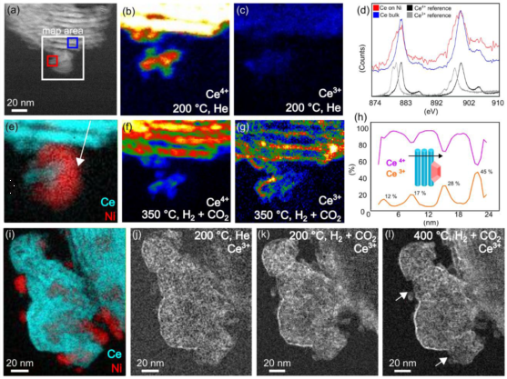 对催化剂活性位点的理解是未来优化和定制催化剂合理设计的基本挑战。例如, Ce4+ 表面位点部分还原为 Ce3+ 以及氧空位的形成对于 CO2 氢化、CO 氧化和水煤气变换反应至关重要。此外,金属纳米颗粒、可还原载体和金属载体在反应条件下容易发生相互作用,因此必须在原位条件下表征催化剂结构,以确定活性状态并推断结构-活性关系。在该工作中,我们分别通过原位定量多模电子断层扫描和原位加热 EELS 研究了 Ni 纳米颗粒修饰的介孔 CeO2 中温度引起的形态和化学变化。此外,我们利用气相TEM的原位 EELS,揭示了Ni诱导的氢溢出对活性Ce3+ 位点形成和整体催化性能增强的作用机制。