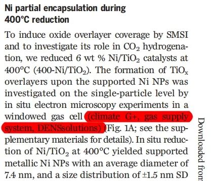 所使用的系统 - Climate 气相加热杆:使用 DENS Climate 原位气相加热样品杆,研究人员可以在TEM中向样品区通入气氛并加热,从而进一步研究 Ni/TiO2 催化剂的演变,引发对 SMSI 的更多思考。