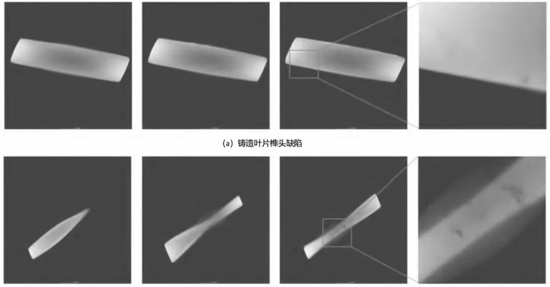 高压涡轮叶片的 CT 扫描图像,铸造叶片榫头缺陷(上)及加工叶片榫头缺陷(下)。图片源于文献