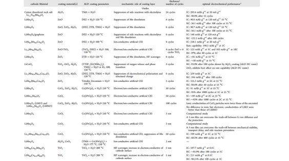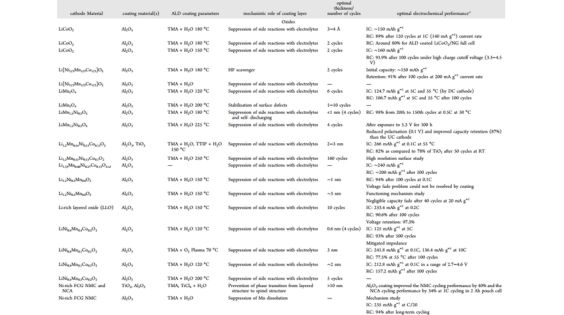 根据电极材料的性质,涂层材料可以是化学钝化的,也可以是导电的。此外,薄膜的厚度、数量和性质决定了其保护和增强性能的能力。目前,PALD 涂层在正极材料中的应用较多(钴酸锂,锰酸锂,镍钴锰酸锂,镍钴铝酸锂,富锂正极,镍锰酸锂等)。