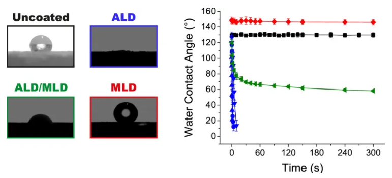 药物粉末尤其是 API,通常为无定形或水合物状态,极易发生团聚。通过 ALD 包覆,可有效改善其分散系和流动性,这对于吸入式药物制剂的研发有重要的促进作用。药物亲水性的调控对其在人体体液中的释放有积极意义,而 ALD 只需几个周期的涂层就可实现不同亲水性或亲油性的样品包覆。