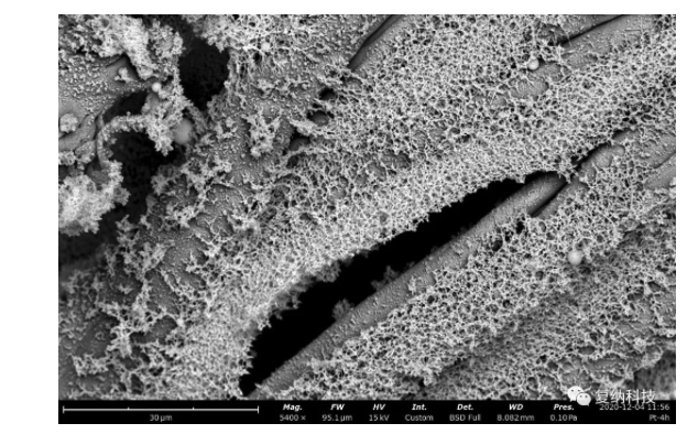 当气流流速较快时,一部分质量较大的颗粒或团聚体具备较大的动量。在于纤维接触后,因为惯性的原因,大颗粒会来不及改变运动方向,从而被纤维拦截。而当沉积的时间足够久,通过冲压沉积形成的颗粒会结合成类似于蜘蛛网的结构,并且将孤立的纤维连接在一起。这种蜘蛛网结构保留了较多的气孔,从而有利于气体的扩散并暴露纤维本身的活性位点。