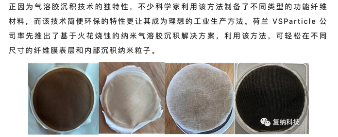 正因为气溶胶沉积技术的独特性,不少科学家利用该方法制备了不同类型的功能纤维材料,而该技术简便环保的特性更让其成为理想的工业生产方法。荷兰 VSParticle 公司率先推出了基于火花烧蚀的纳米气溶胶沉积解决方案,利用该方法,可轻松在不同尺寸的纤维膜表层和内部沉积纳米粒子。