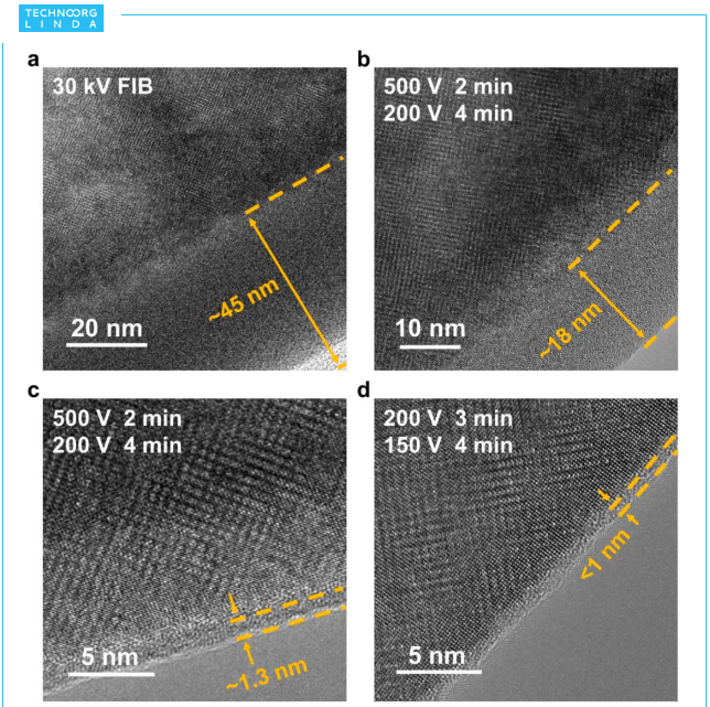 上图为去除 FIB 产生的表面非晶层的完整流程。(a) 30 kV FIB 切割样品的HRTEM 照片。(b-d) 连续使用低能氩离子精修后的 HRTEM 结果。图片中标识了对应的精修参数和非晶层厚度。
