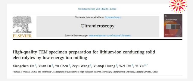 于奕老师的该项工作成果以 High-quality TEM specimen preparation for lithium-ion conducting solid electrolytes by low-energy ion milling(使用低能离子精修制备高质量的锂离子导体固态电解质透射电镜样品) 为题,发表在《Ultramicroscopy》上。