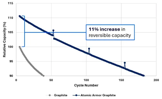 图 3. 使用原始石墨负极和涂有 Atomic Armor™ 涂层的石墨负极的电池在 4.2V 电压下循环的相对容量。