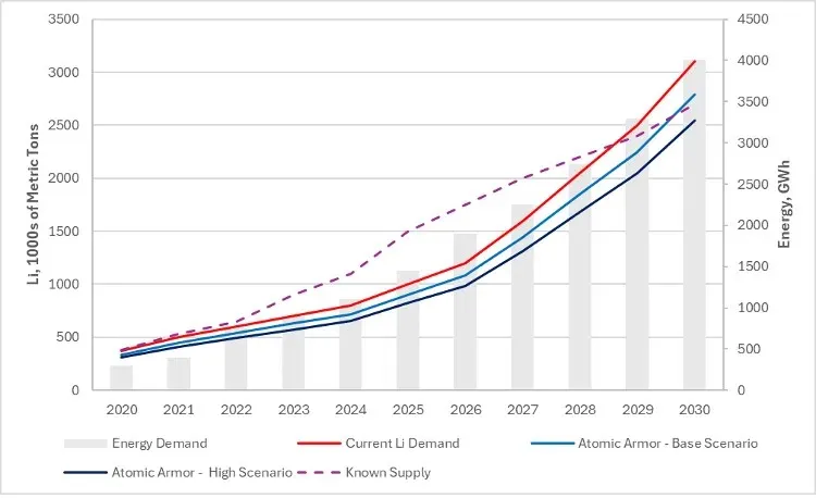 图 5. 到 2030 年的锂和能源需求以及已知的锂供应量。Atomic Armor™ 基础方案显示了千兆工厂产量增加 10% 后的锂需求。Atomic Armor™ 高方案显示了产量增加 18% 后的锂需求。