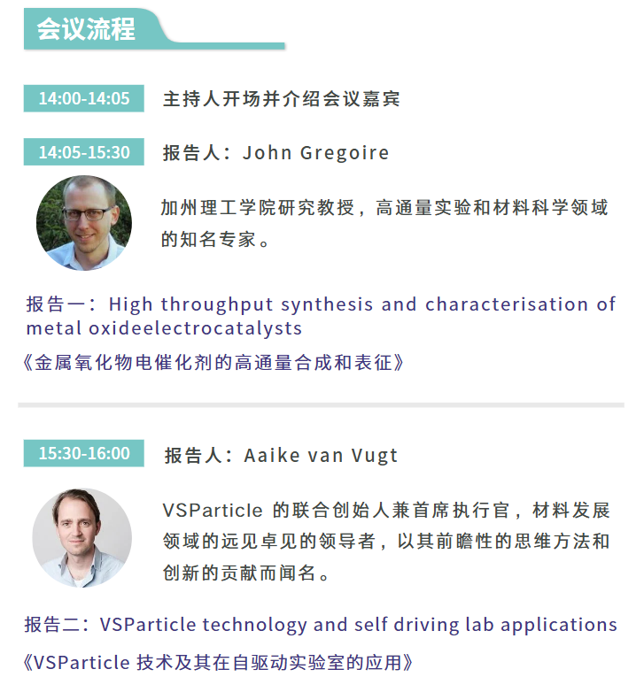 本次研讨会我们有幸邀请到加州理工学院研究教授 John Gregoire 和 VSParticle 联合创始人 Aaike van Vugt 为我们深度介绍干法纳米气溶胶打印技术及其在高比表面积的纳米多孔薄膜的制备工艺上的应用。