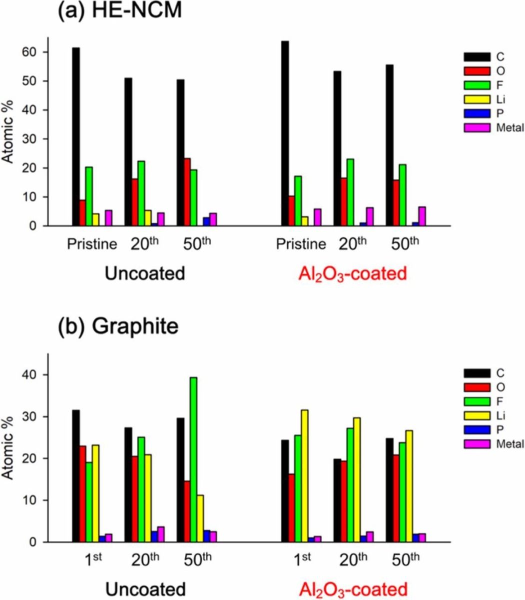 此外,Jurng 等人【8】认为 ALD Al2O3 沉积在富锂 NMC PC 正极上,减少了过渡金属的溶解和交换,限制了过渡金属在负极表面的积累,从而减少了由过渡金属析出引起的负极表面电解质降解。同时观察到石墨负极的电阻降低,这是由于 PC 正极中过渡金属的溶解被有效阻止。