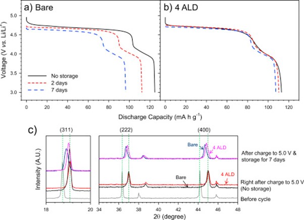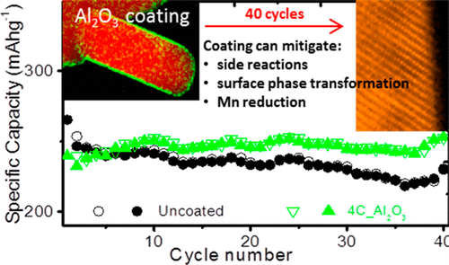 他们进一步得出结论,ALD Al2O3 涂层会优先覆盖过渡金属结合位,这种不均匀的表面覆盖为Li 离子的运动提供了无限制的途径。而较厚的涂层不仅会增加离子和电子流动的阻力,而且会使单个颗粒产生物理隔离,从而阻碍其与导电添加剂的直接接触。