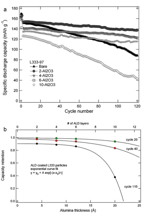 NMC 材料因其高容量和低成本而备受关注。Riley 等人【10】的研究展示了 ALD Al2O3 涂层在 NMC333 上的应用,证明了涂层能显著提高电池的容量保持率和循环稳定性。与 UC 正极的 65% 的容量保持率相比,UC 正极的容量保持率提高到91%,并且即使在 100 次充放电循环后,保形涂层 Al2O3 厚度依然小至4 Å(2cycle ALD),体系电阻也有所降低,但进一步增加 Al2O3 的厚度会降低电化学稳定性。