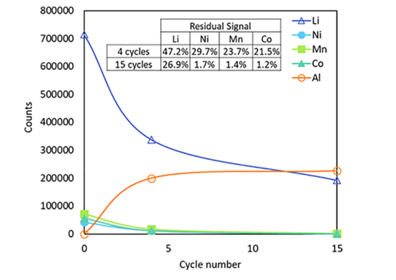 Li、Al、Ni,、Mn和Co 的绝对信号计数来自 TOFSIMS。残余信号百分比(相对于 UC)。这些值清楚地表明 ALD 优先沉积氧化铝在过渡金属表面的位置。而即便 15 个 cycle 以后,Li 的信号仍然很明显。