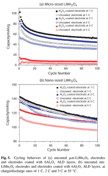 LiMn2O4(LMO)是一种低成本、高电压的正极材料,但其电导率差和 Li+ 扩散缓慢限制了其性能。Luan【3】等人的研究中,通过 ALD Al2O3 涂层改善了 LMO 在高温下的性能。通过对两种不同尺寸的锰酸锂颗粒进行包覆,在1C,2C,5C 的倍率下测试其高温性能,发现均优于未包覆的电极。
