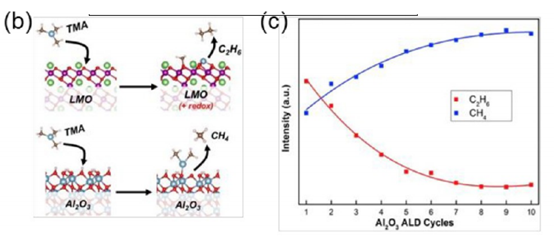 Chen【4】等通过实验表征和密度泛函理论(DFT)计算发现,Al2O3 在 10 个 ALD 循环下呈现亚单层覆盖(不均匀生长)。在 ALD 过程中,LMO 与铝前驱体表面反应的产物 C2H6 气体逐渐减少,表明在 ALD 循环过程中,LMO 表面可用位点越来越少。通过 1-2 次 ALD 循环,LMO 表面缺陷趋于稳定,从而提高了电化学性能。