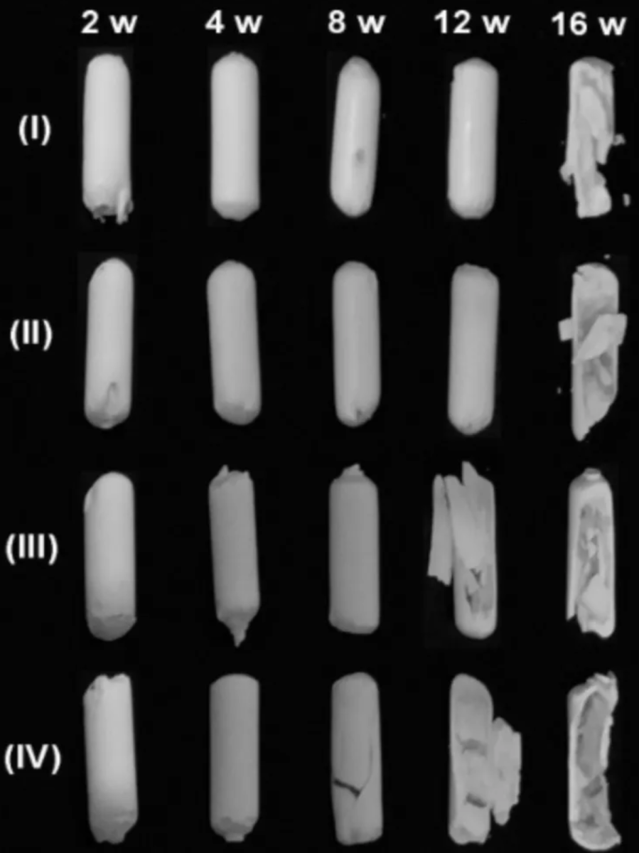 使用显微CT检测高分子材料在 0-16 周降解过程中大体标本观的改变:(I)HA/PLGA,(II)30PGA/HA/PLGA,(III)50PGA/HA/PLGA,(IV)70PGA/HA/PLGA。图片源自文献【1】
