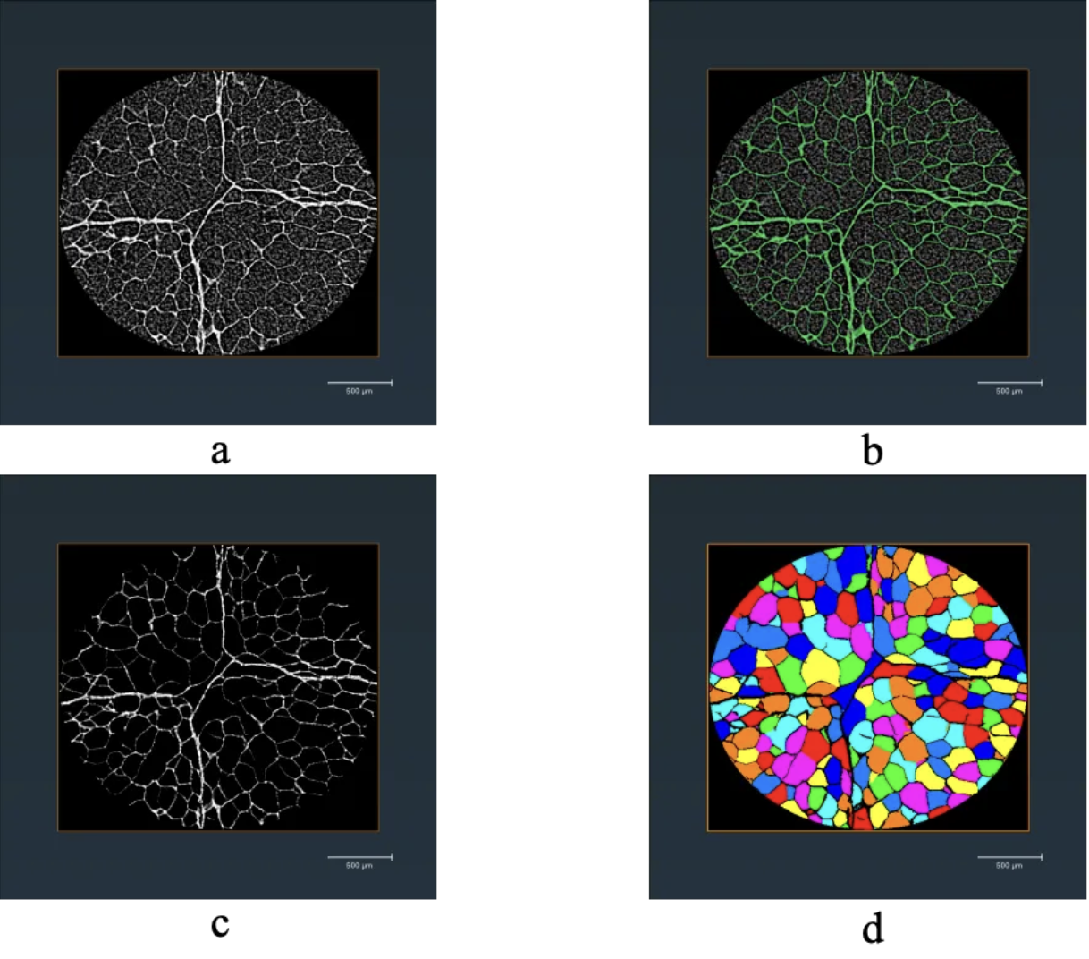 多聚泡沫材料不同相提取效果。图a.前处理图像 图b.提取细胞壁 图c.细胞壁二值化 图d.空腔提取、划分结果
