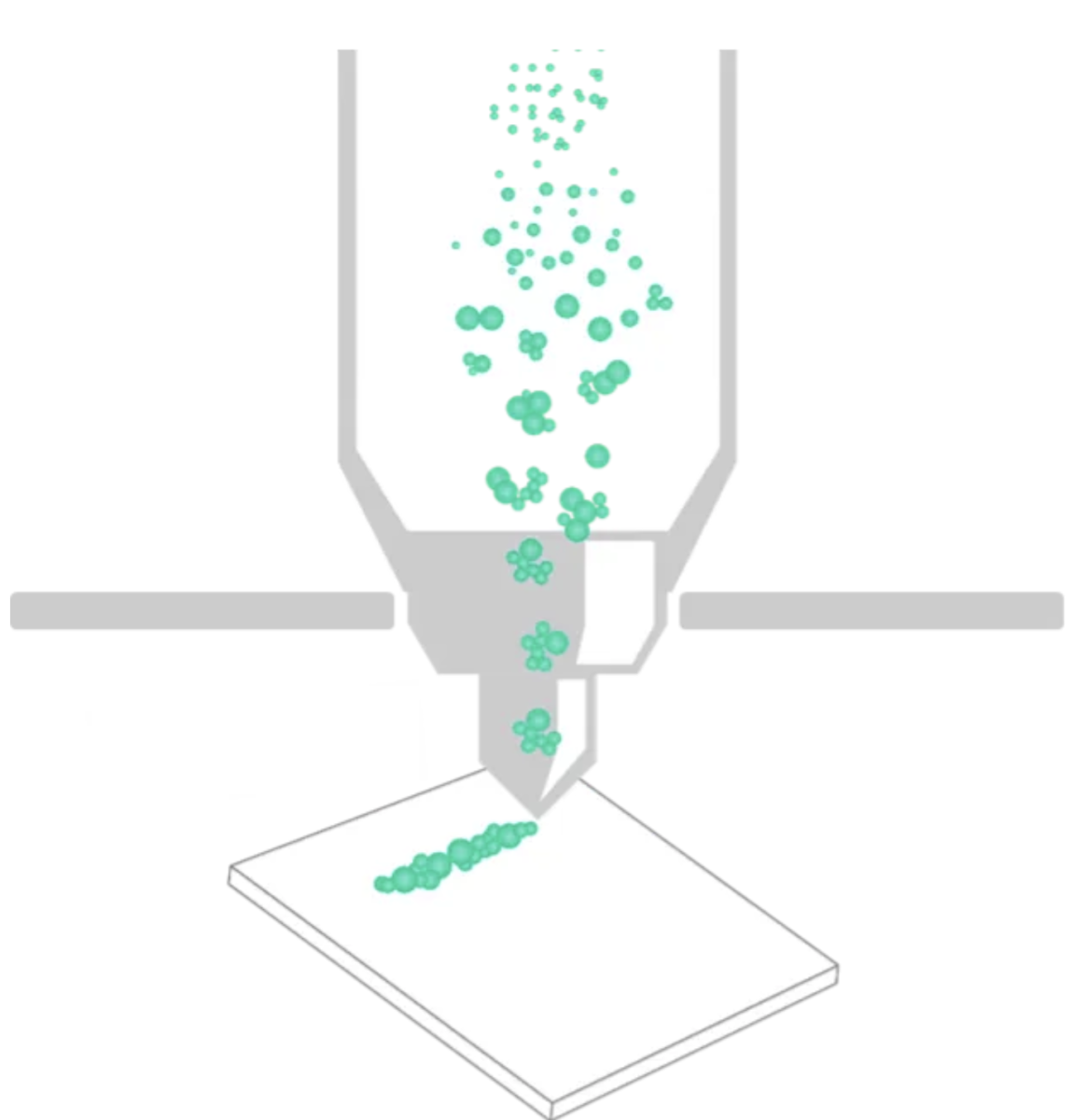 使用冲压惯性冲击结合 XYZ 三轴移动的纳米打印,可将催化剂直接打印在基底表面,并调整喷嘴的移动速度从而实现不同的催化剂覆盖密度。颗粒会因为惯性和高速射流的动能冲击作用在基底表面形成覆盖。