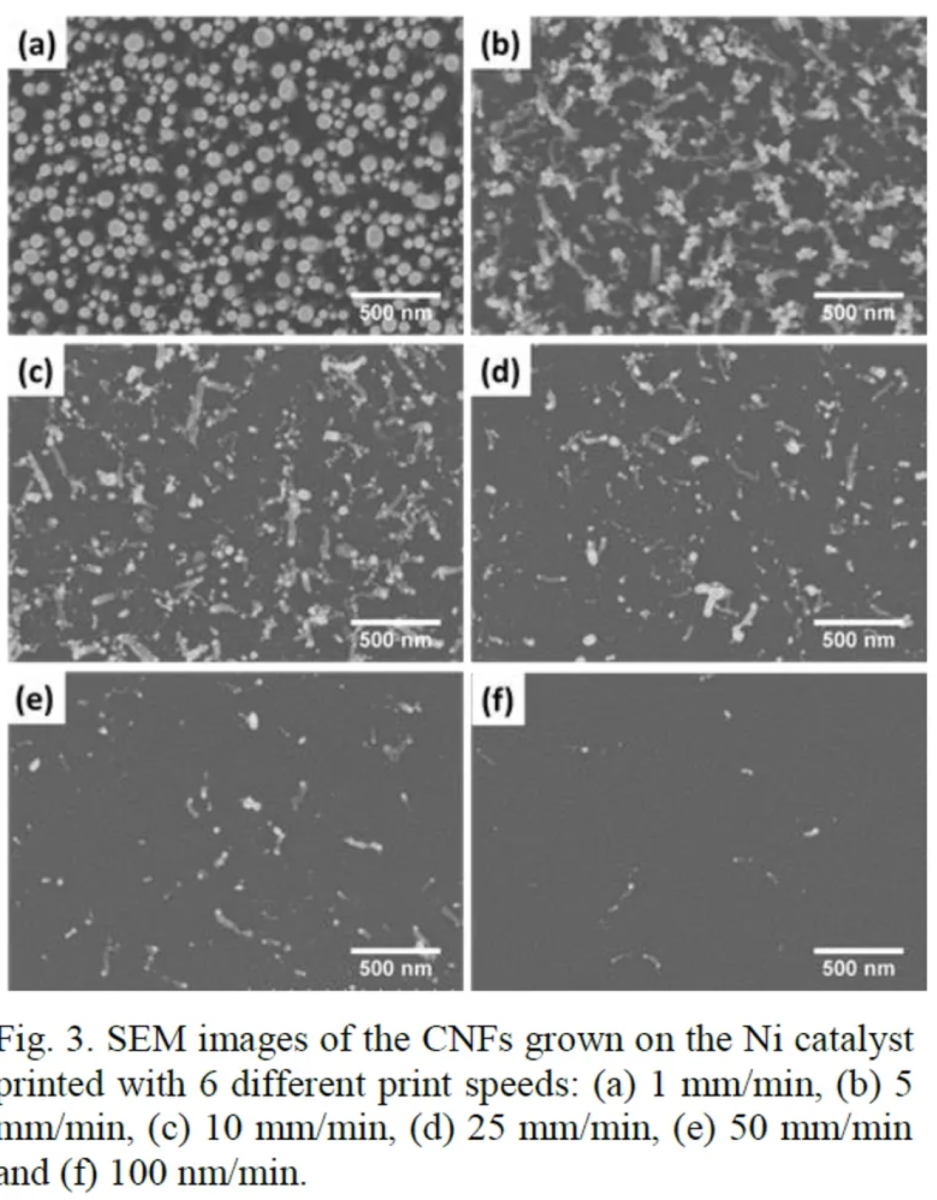 在更广泛的应用领域中,精确控制图案化的碳纳米纤维(CNFs)阵列是一个新兴方向,可应用于传感器与电极。在目前的研究中,通过气溶胶火花蚀刻技术制备镍催化剂并进行直写打印,之后通过 PECVD 方法生长 CNFs。通过调整打印速度来改变催化剂密度,并表征预图案化线条中的 CNFs 分布。根据打印速度的不同,可以获得不同的 CNFs 分布,从密集的垂直排列的 CNFs(VACNFs)到稀疏的单个 CNFs。