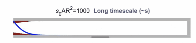 第一个动画,其中 S0AR2=0.01,对应于反应限制生长。为了完整地表示生长过程,此动画分为“短时间尺度”部分和“长时间尺度”部分。在现实生活中,这些阶段分别大约需要微秒和秒,具体取决于实验条件。在短时间尺度部分,我们可以看到蓝线移动到沟槽中,直到它在各处具有相同的值。这对应于气相反应物分子扩散到沟槽中,直到它们均匀分布。在长时间尺度部分,我们可以看到这导致表面覆盖率均匀增加,如红色轮廓所示。
