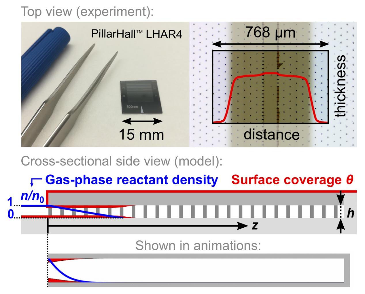 图 4:在实验中使用的由 VTT 提供的 PillarHall ™水平沟槽结构图片(顶部),其中硅膜被移除,沉积的薄膜可见。结构的示意横截面(中间)显示了气相反应物密度(蓝线)和表面覆盖率(红色轮廓)。