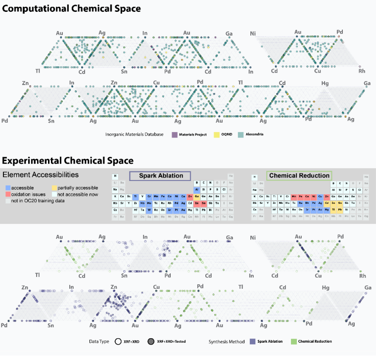(上)考虑到用于计算数据的成分多样性和综合性,映射和显示集合了MP、OQMD和 Alexandria的数据库源。(下)通过两种合成方法(化学法和 VSP 火花烧蚀)描述元素的可行性,以及所有实验合成、表征和测试样品的Chemical Space。较深阴影的三元相图是由多个图连接而成的,该项目未进行探索