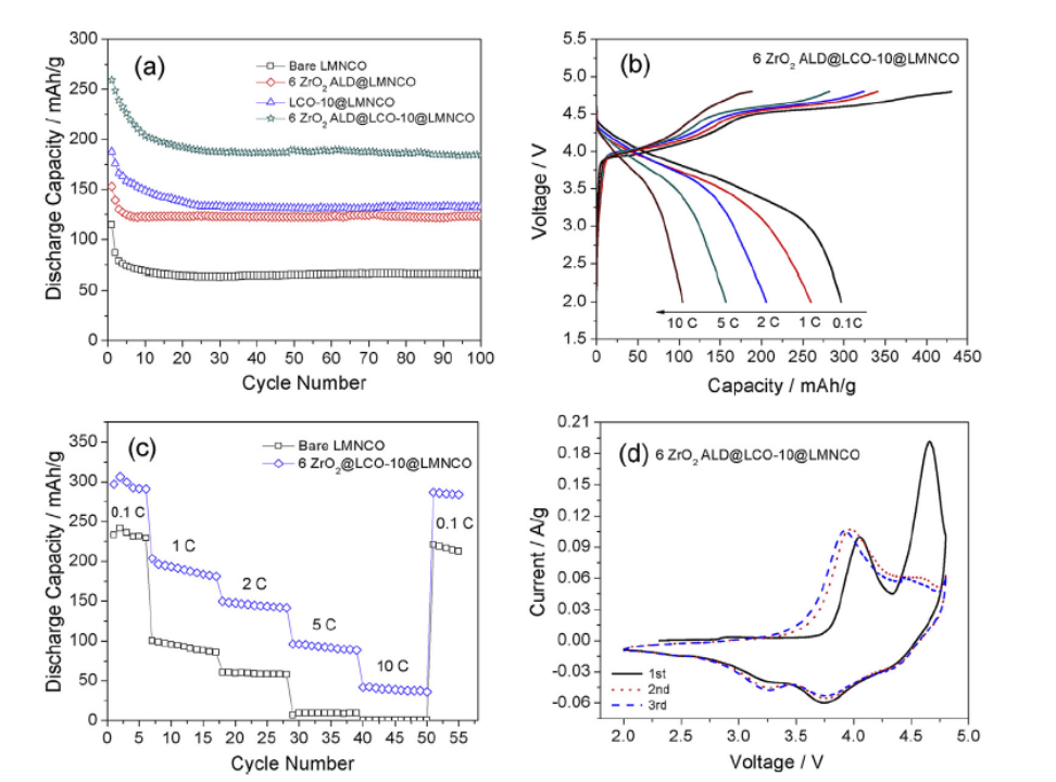 进一步研究中,Zhao等人[3]报道了分层功能层对富锂层状 Li1.2Mn0.54Ni0.13Co0.13O₂(NMC)纳米颗粒的协同效应。通过结合不同锂化学计量材料(如LiCoO₂、LMO 和 LiCoMnO₄)作为初始壳层,并以ALD氧化物(ZrO₂、Al₂O₃ 和 TiO₂)作为最终涂层,设计出高性能 LIB 阴极。