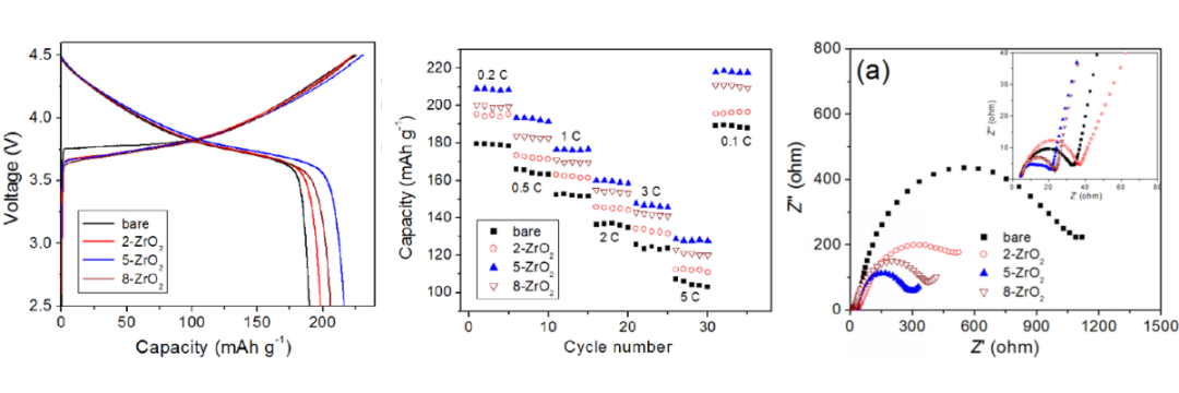 提高倍率性能:ZrO2包覆增强了LiNi0.5Co0.2Mn0.3O2 在高倍率下的放电容量。在5 C倍率下,5-ZrO2 电极的放电容量为128.7 mAh g−1,而裸电极仅为107.2 mAh g−1。