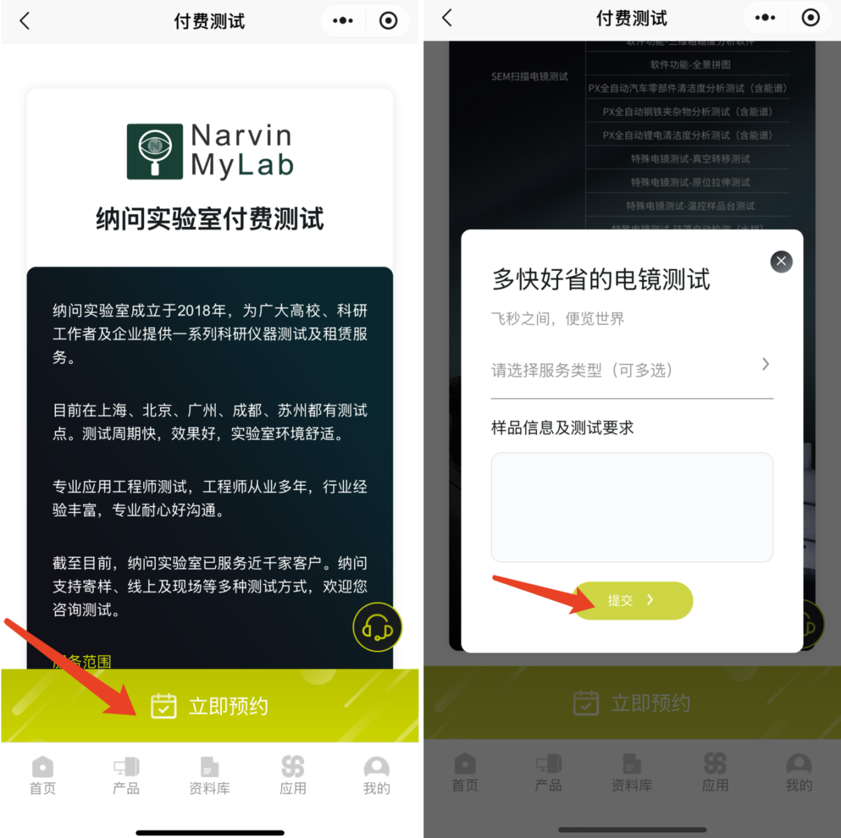 第四步:点击立即预约,填写您需要的服务类型以及样品信息和测试要求
