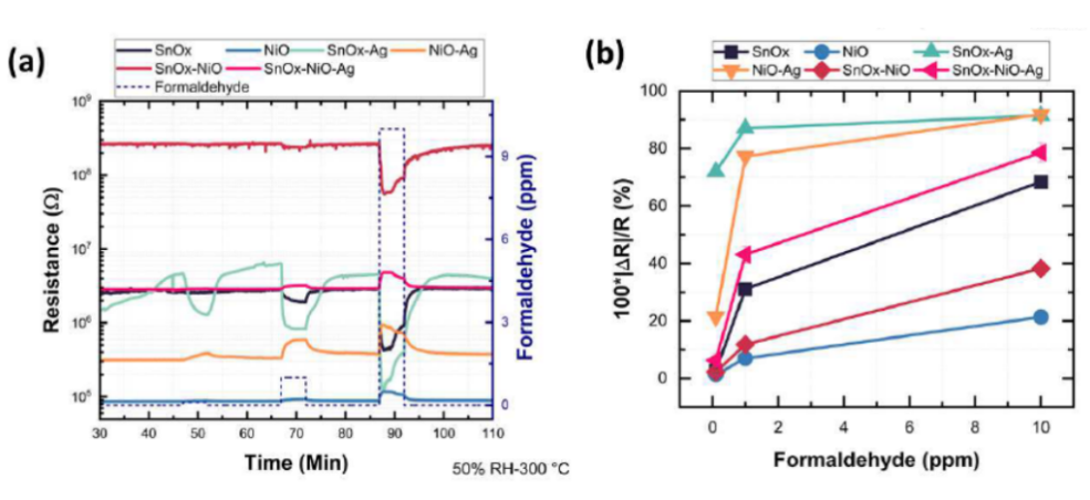 甲醛是一种常见的室内空气污染物,对人体健康具有严重危害。VSP-P1 技术制备的 SnO₂-Ag 传感器在 0.1 ppm 甲醛浓度下表现出高达 70% 的响应,而在 10 ppm 浓度下,响应趋于饱和,显示出优异的灵敏度和动态响应范围。二元合金(SnO₂-Ag)和三元合金(SnO₂-NiO-Ag)传感器在不同浓度下表现出优异的灵敏度和线性响应。
