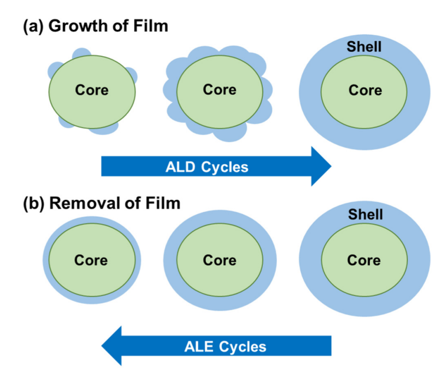 壳层形态保持:即使在 ALE 过程中,ZrO壳层仍然保持了球形,这表明 ALE 技术能够在不破坏纳米粒子形态的情况下精确地减少壳层厚度。