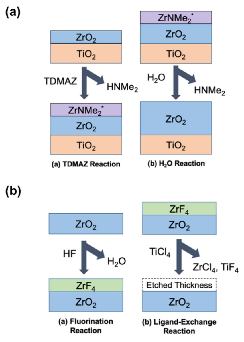 2(a) 基于 TDMAZ(四甲基二甲氨基锆)和 HO(水)的连续反应的 ZrO原子层沉积(ALD)机制。(b) 基于HF(氢氟酸)用于氟化和 TiCl(四氯化钛)用于配体交换的连续反应的 ZrO 原子层刻蚀(ALE)机制。