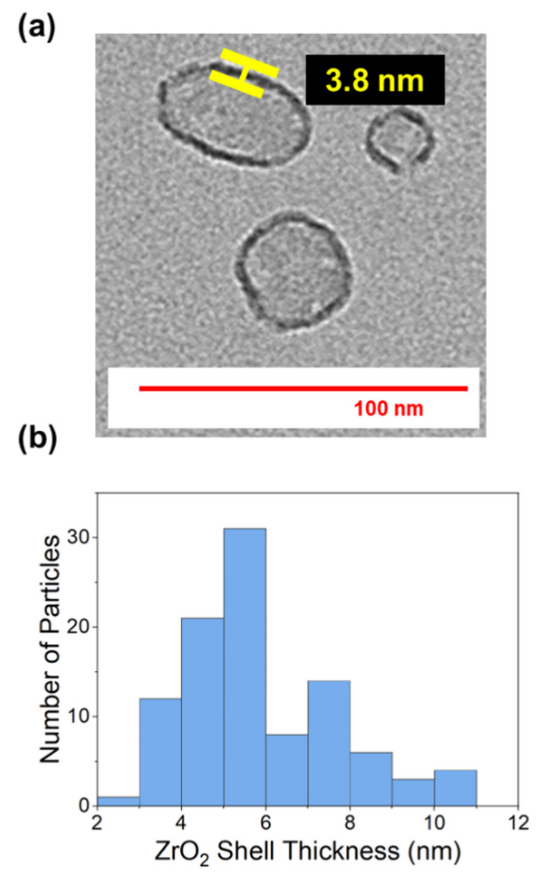 3(a) 来自 Nanoshel 的TiO/ZrO核壳纳米粒子的透射电子显微镜(TEM)图像。(b) 基于对100个TiO/ZrO核壳纳米粒子进行 TEM 测量所得的 ZrO壳层厚度分布的直方图。