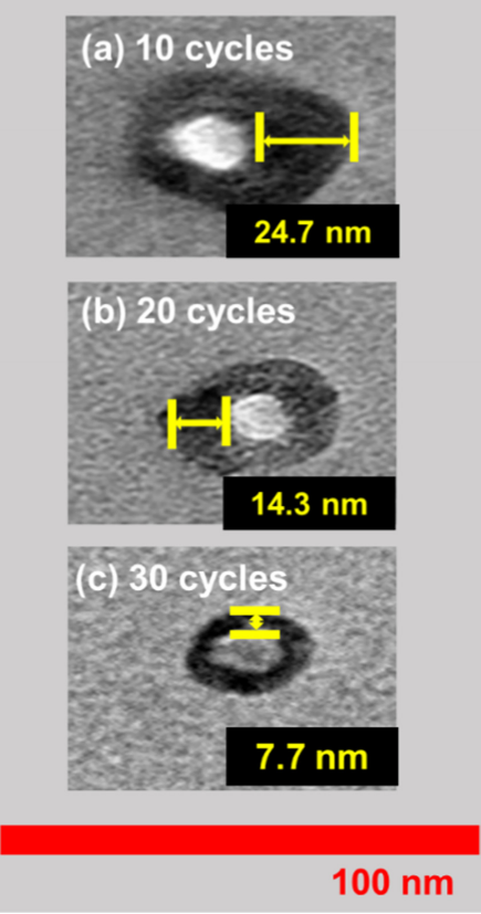 5.经过 (a) 10次、(b) 20次和 (c) 30次 ZrO原子层刻蚀(ALE)循环后的 TiO/ZrO核壳纳米粒子的透射电子显微镜(TEM)图像。
