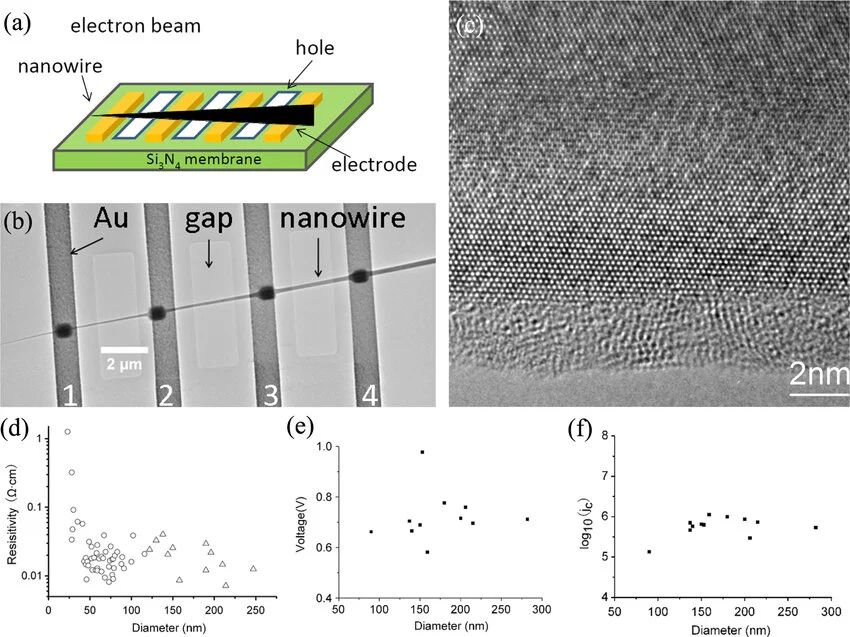 (a) 原位电学测量芯片示意图。一根锥形纳米线连接到硅氮(SiN)膜上的四个电极。膜上制作了缝隙,允许无阻碍地对悬挂在这些缝隙上的纳米线进行透射电子显微镜(TEM)成像。(b) 带有铂(Pt)接触点的纳米线的明场TEM图像,接触点显示为黑色区域。(c) 高分辨率TEM图像,显示了大约2纳米的氧化层。(d) 不同直径的电阻率数据(Δ:本文数据,o:文献数据)。(e) 击穿起始的临界电压与直径的关系图。(f) log10(jc)与直径的关系图,其中jc是击穿临界电流密度,单位为A cm⁻²。