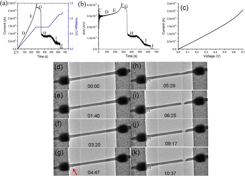 研究表明,利用基于 MEMS 的纳米芯片进行电学实验,可以避免由于焦耳加热而引起的 NWs 高温加热现象。同时 TEM 成像和电学测试表明,随着电流的增加,NW 在阴极侧发生击穿。同时提出了电迁移机制和击穿过程的焦耳加热。