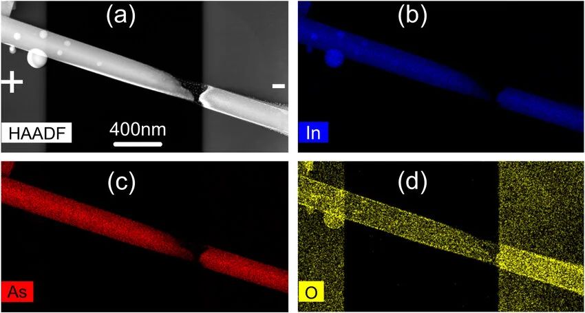 (a)击穿后 InAs NW 的 HAADF 图像,在靠近阳极处观察到铟颗粒,而击穿发生在靠近阴极处。(b) - (d) InAs NW的 EDX 元素分布图。