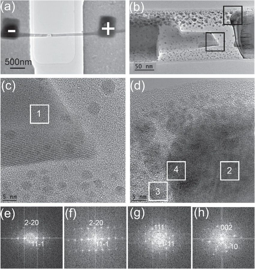(a) 击穿后锥形 InAs 纳米线的低倍放大图像。(b) 断裂区域的放大图像。(c) 和 (d) 分别对应于 (b) 中左侧和右侧方框区域的高分辨率电子显微镜(HRTEM)图像。(e) 至 (h) 分别对应于 (c) 和 (d) 中标示的区域1至4的快速傅里叶变换(FFT)图案。