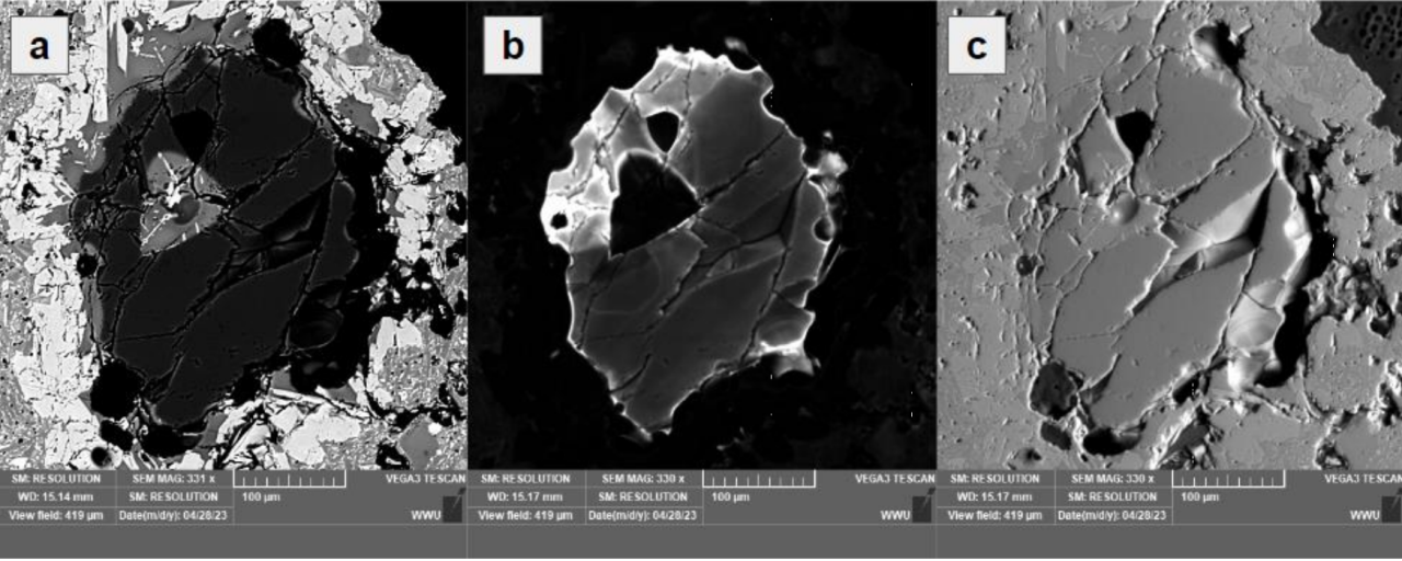 来自样品1、2和3的石英团块的扫描电子显微镜(SEM)背散射电子(BSE)成像。每个单元至少有一个石英晶体具有极小或没有单斜辉石反应边,以及具有单斜辉石反应边的石英异晶体。