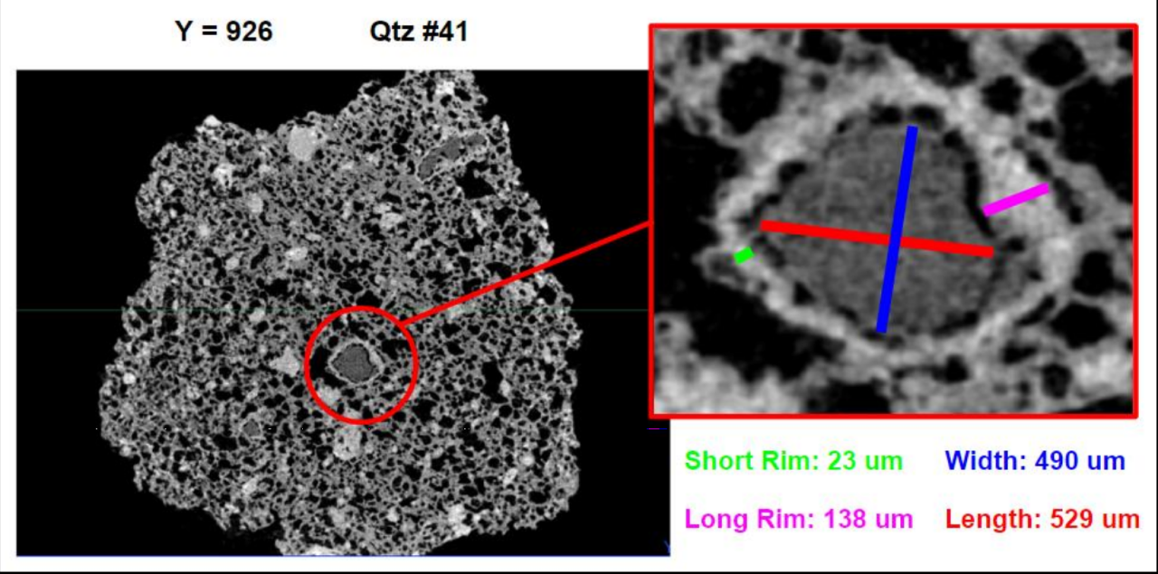显微CT反应边厚度和直径测量方案。扩展的石英晶体上的每条线对应相同颜色的长度值。上图所示的石英是来自火山灰团块2CC02-H2D的Qtz #41,这是在显微CT下分析的49个石英晶体之一。