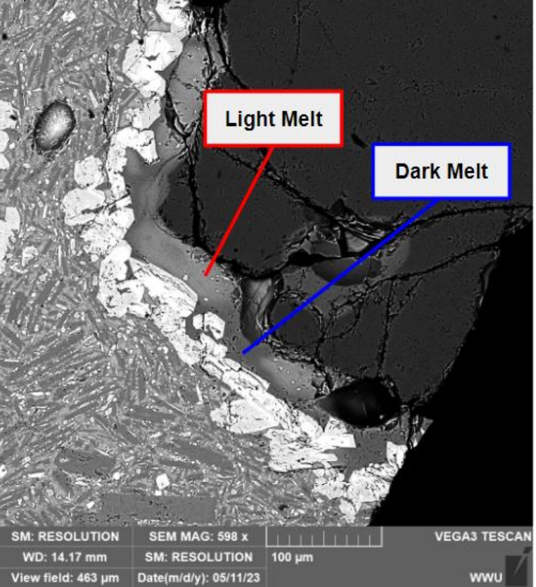 在石英与反应边之间普遍存在一层成分不同于背景基质的熔体透镜,其地球化学特征显示出 SiO₂ 和TiO₂ 含量升高。这一变化说明,在石英晶体融化过程中,局部形成了富硅熔体,与周围基质岩浆发生小尺度混合,并促成了辉石的结晶。这一过程支持了非平衡条件下反应边形成的机制,类似于实验岩石学中通过人为模拟所观察到的“冠状结构”。