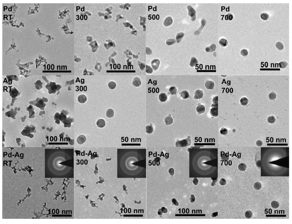不同飞行时间烧结温度的 Pd,Ag 以及 Pd-Ag 合金纳米粒子的 TEM 图像