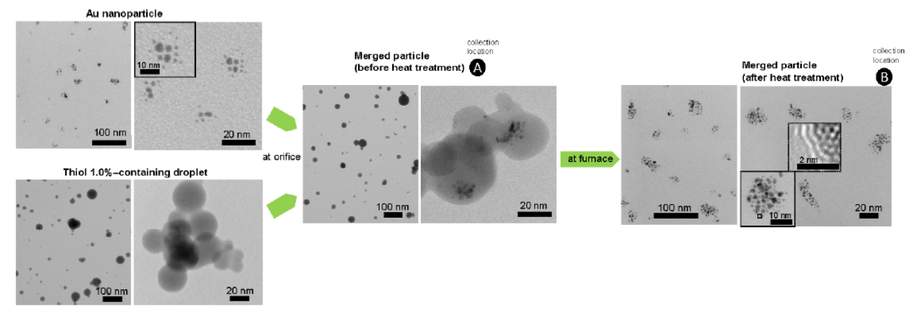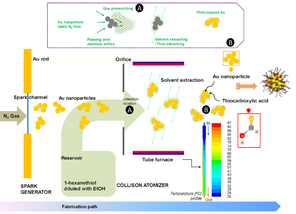 Byeon【5】利用火花放电产生的金纳米颗粒与 1-己硫醇溶液(使用碰撞雾化器将溶液雾化成细小液滴)混合,通过一个加热至 90°C 的管式反应器后,乙醇从液滴中蒸发,留下硫醇包覆的金纳米颗粒,并研究其在基因转染中的应用。