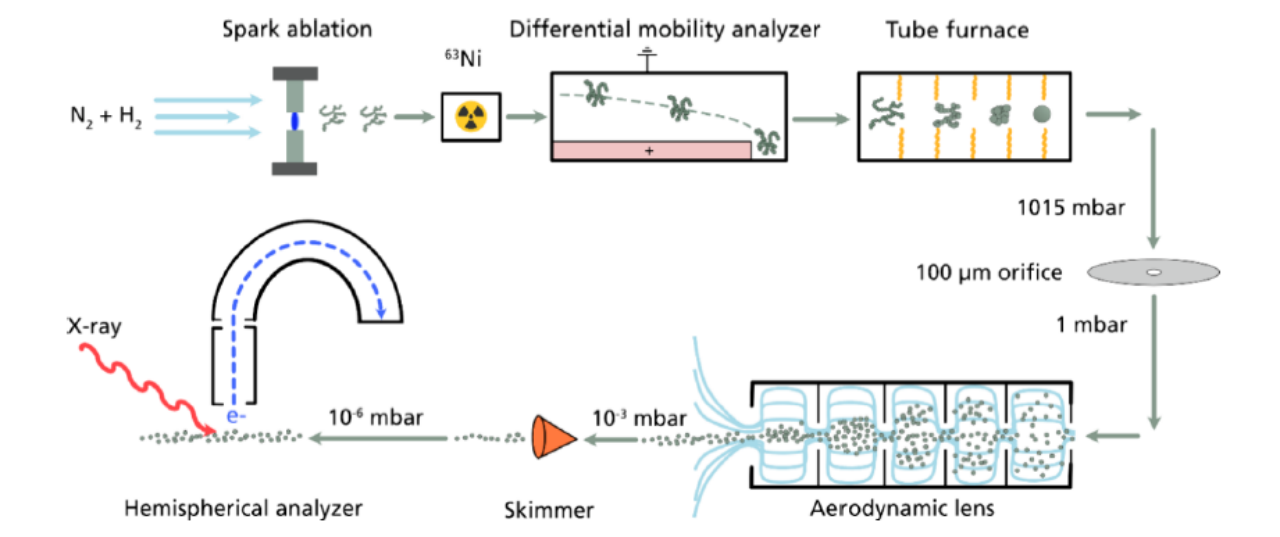而在另一篇工作中,Preger【2】采用管式炉的飞行时间烧结,生成锡氧化物纳米颗粒,利用气溶胶样本输送系统和飞行时间 X 射线光电子能谱技术,实时监测锡氧化物纳米颗粒在气相生成过程中的表面氧化态研究。飞行时间烧结加热可有效调控锡氧化物纳米颗粒的表面氧化态。