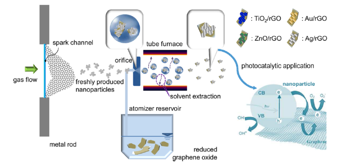 由于常压放电的优势,火花放电可以很轻易的与其它非真空气相沉积技术结合,从而获得新型复合材料。如 Byeon【4】将产生的 TiO₂ 纳米颗粒与 rGO 溶液在碰撞雾化器处混合,形成混合液滴。液滴通过加热的管式反应器,使溶剂蒸发,得到 TiO₂/rGO 杂化纳米片。最后用机械过滤法将 TiO₂/rGO 杂化纳米片从气流中分离,并在洁净环境下保存为粉末。
