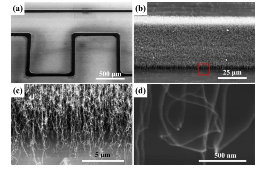 通过改变催化纳米颗粒的沉积时间控制其密度。当沉积时间足够长(10分钟或更长),能够实现垂直排列的高密度 CNTs 生长;而当沉积时间过短(小于10分钟),则只能生长出低密度且方向混乱的CNTs。