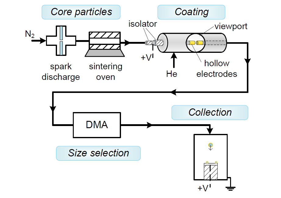 同样的,在 Pfeiffer【8】的工作,利用两台火花放电发生器产生 Ag 和 Au 核颗粒,并在流动的 N₂中重塑成约 40nm 的球形颗粒;聚苯乙烯乳胶(PSL)纳米球通过雾化器和干燥器处理后作为低表面能核心颗粒。