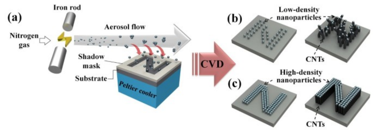 碳纳米管(CNTs)因其独特性能在众多设备应用中备受关注,而将 CNT 集成到器件中不可避免地需要控制其位置和/或密度,这需要在选定区域沉积金属催化剂实现。Park【10】通过用火花放电法生成用于碳纳米管合成的催化气溶胶纳米粒子,利用影罩在基底上实现催化纳米颗粒的图案化沉积,从而通过化学气相沉积合成碳纳米管。通过改变催化纳米颗粒的沉积时间以及影罩与基底之间的间隙距离,分别控制 CNTs 的密度和图案。
