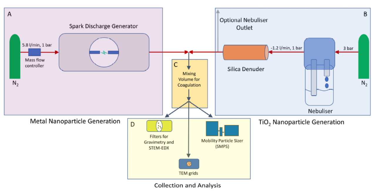 颗粒表面负载团簇及纳米粒子一直是构筑负载型催化剂的通用方法,但传统制备方案均采用液相化学法,如浸渍,溶胶凝胶等方式实现催化剂制备。但该方法仍存在配方普适性不强,引入太多化学前驱体的弊端。Gfeller【7】采用火花放电,能够产生高纯度的金属纳米颗粒,结合雾化法气溶胶发生器,可将作为载体的 TiO2 颗粒形成气溶胶束流,在吸附金属气溶胶后,形成负载型催化剂材料。