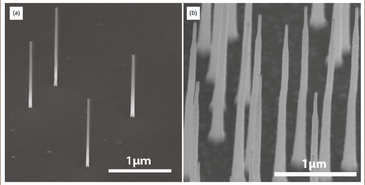 GaP 及 InP 纳米线生长的 SEM 图像,均使用烧结后的 Au 颗粒作为种子层